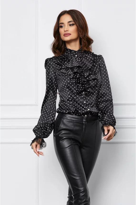 Camasa MBG neagra cu buline albe si volanase la bust – CUMPARA ONLINE