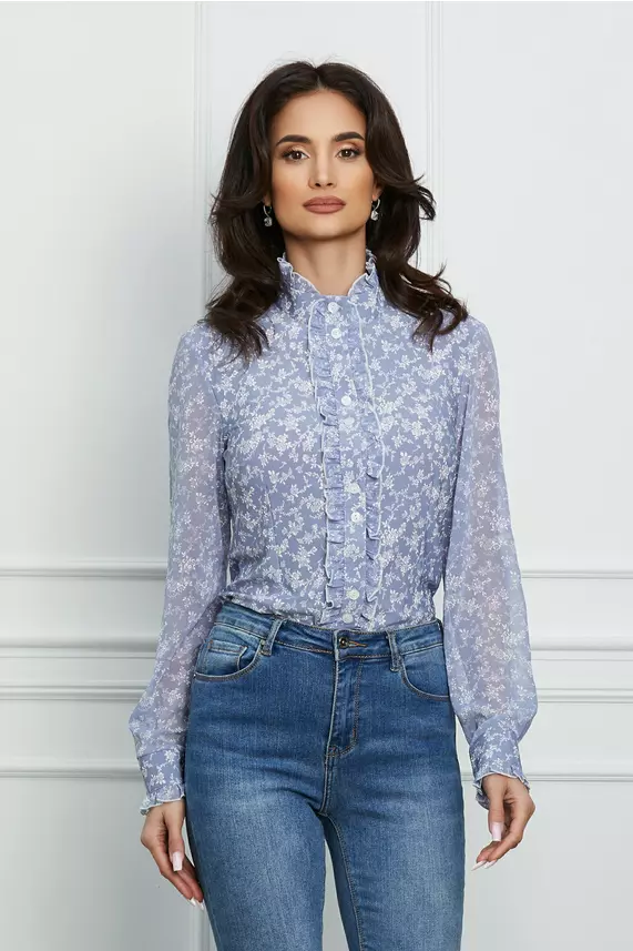 Camasa Sorina bleu cu guler si imprimeu floral alb – CUMPARA ONLINE pe dyfashion.ro