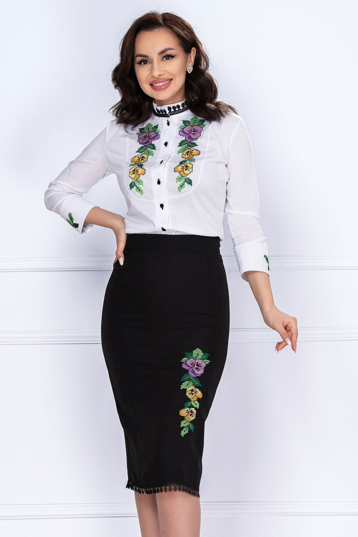 Camasa office dama alba Fofy cu guler negru brodat – CUMPARA ONLINE