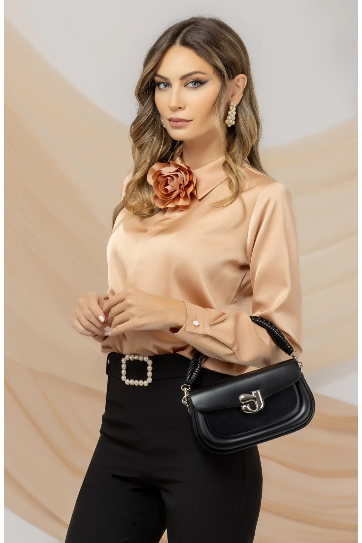 Camasa elegata Pretty Girl bej satinata cu floare decorativa- CUMPARA ONLINE pe inpuff