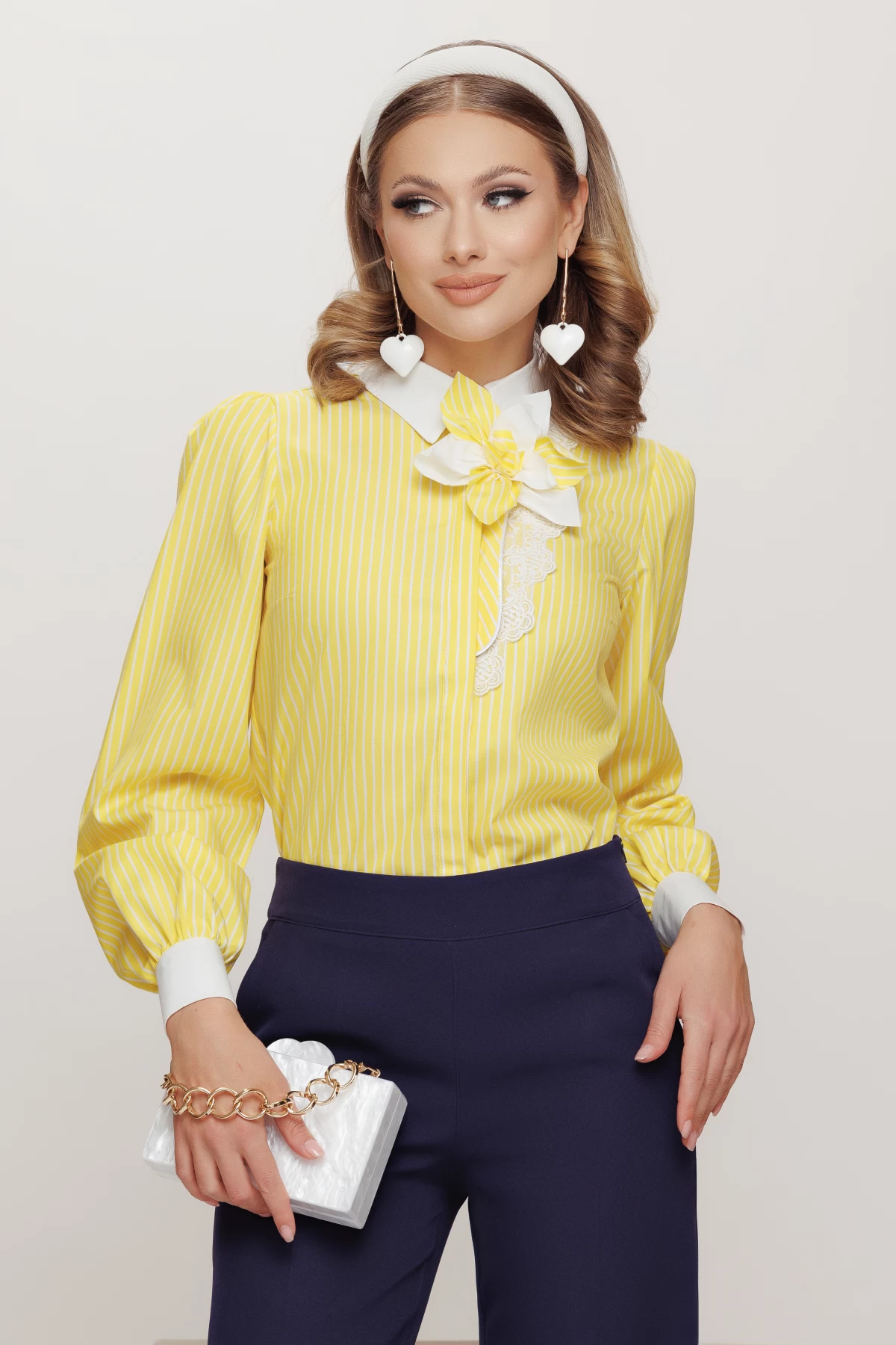Camasa dama din bumbac galben cu dungi si floare detasabila – CUMPARA ONLINE pe inpuff