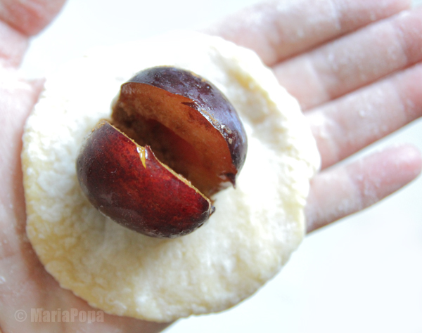 Adaugam pruna si o imbracam in aluat, avand grija ca galusca sa fie bine inchisa.