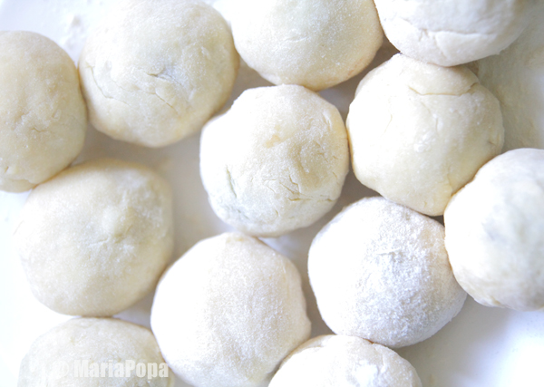 Impartim aluatul in 12 parti egale si modelam fiecare bila cu ajutorul fainii.