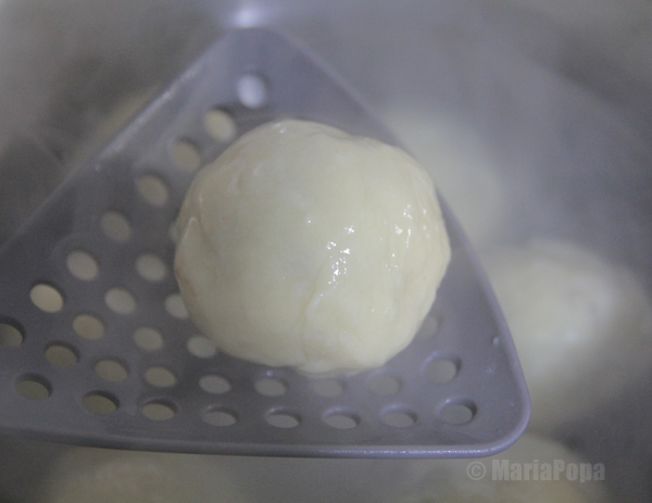 Punem intr-o cratita 3 l apa si 1 praf sare. Asezam la foc iute, iar cand ajunge la punctul de fierbere adaugam jumatate din galuste. Le fierbem , la foc mediu, pana se ridica si stau deasupra, maxim 5 minute.La fel procedam si cu restul de galuste.