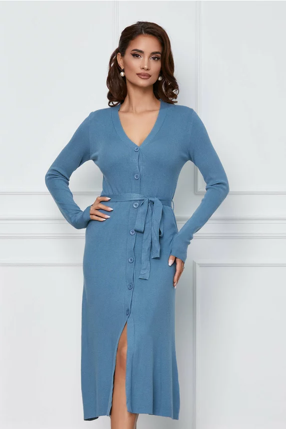 Rochie Ayana albastra din tricot cu nasturi si cordon – CUMPARA ONLINE