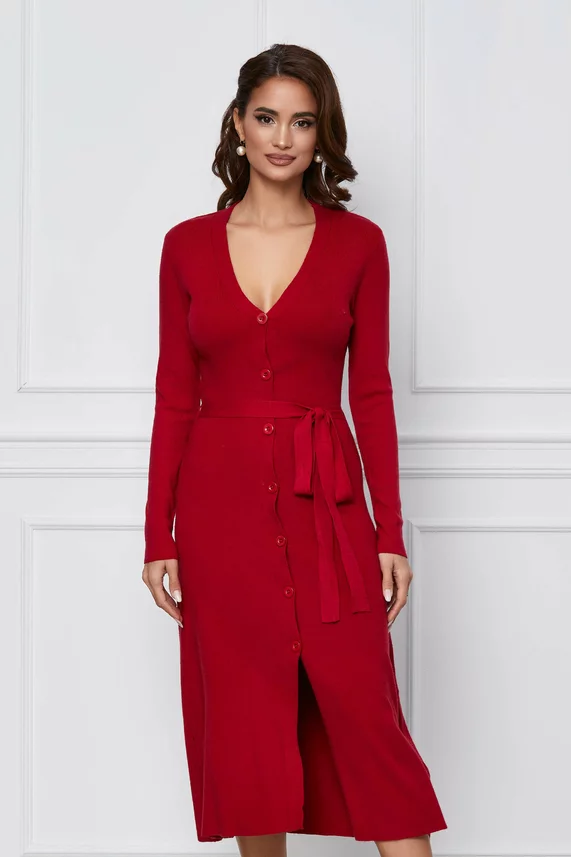 Rochie Ayana bordo din tricot cu nasturi si cordon – CUMPARA ONLINE
