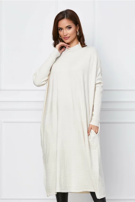 Rochie Madalina ivory din tricot reiat cu crepeuri la baza- CUMPARA ONLINE pe dyfashion