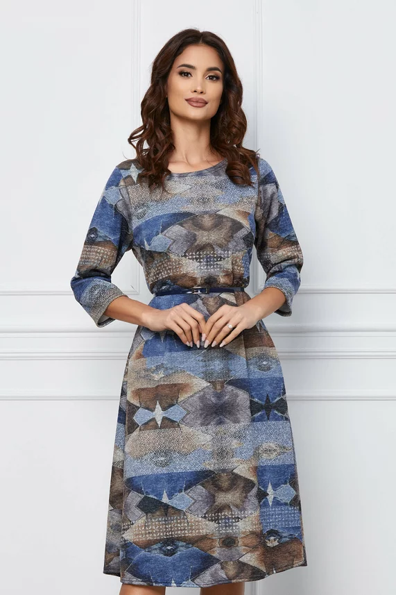 Rochie Sorana albastra cu imprimeu maro si curea in talie – CUMPARA ONLINE